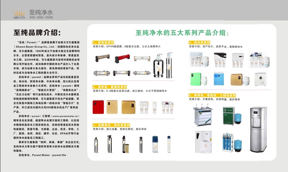 至純凈水(purest)品牌是隸屬于加拿大百爾盛集團(tuán)(Shawn Bayer Group Co., Ltd.)的國(guó)際知名凈水品牌。至純凈水(purest)品牌全系列產(chǎn)品包括能量直飲機(jī)、純水機(jī)、廚房凈水器、中央凈水器、軟水機(jī)以及商業(yè)工程類凈水設(shè)備六大系列,擁有“高頻微廢水”、“智能芯片管控”、“雙膜雙出水”、“無(wú)壓力自吸”等行業(yè)領(lǐng)先技術(shù)。秉承百爾盛集團(tuán)“純粹、真誠(chéng)、奉獻(xiàn)”的企業(yè)文化,為客戶提供有競(jìng)爭(zhēng)力的凈水處理解決方案和服務(wù)。至純凈水,Purest Water,purest life。