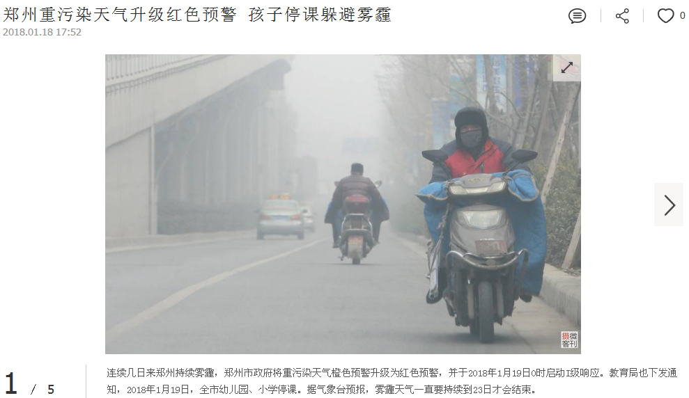 連續(xù)幾日來鄭州持續(xù)霧霾,鄭州市政府將重污染天氣橙色預警升級為紅色預警,并于2018年1月19日0時啟動I級響應。教育局也下發(fā)通知,2018年1月19日,全市幼兒園、小學停課。據(jù)氣象臺預報,霧霾天氣一直要持續(xù)到23日才會結(jié)束。